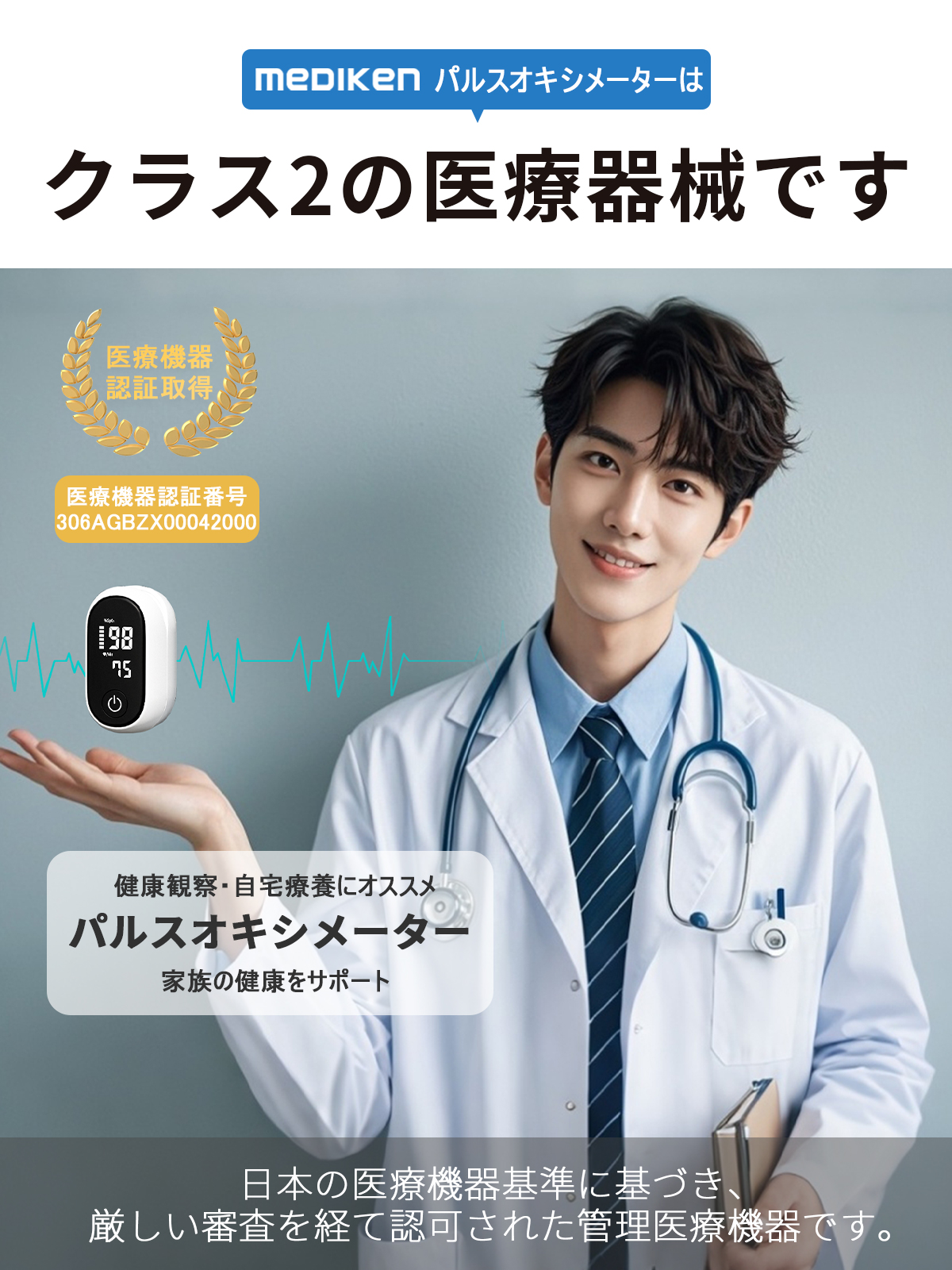 | 確度 | 酸素飽和度 (SpO2): ・70%〜100%の場合:確度±3% ・70%未満の場合:規定なし 脈拍数 (PR):±2bpm |