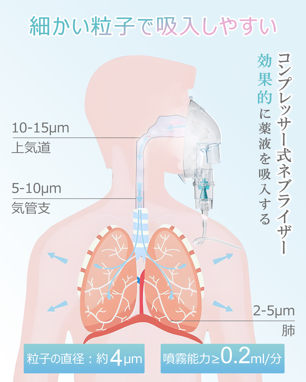 ネブライザーは液状の吸入薬を細かい霧状にすることによって、患者が口や鼻から呼吸をすると共に