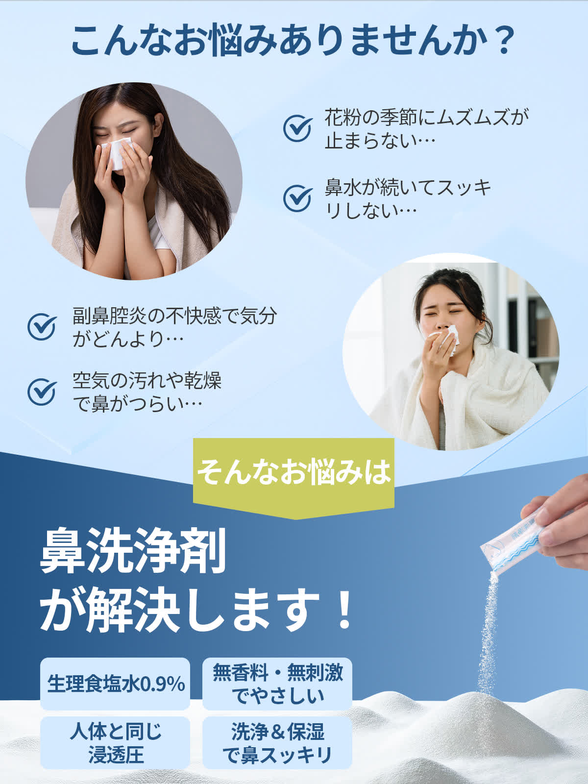 - ※鼻·耳の炎症、鼻プまりがひどい場合は、ご使用前に専門医の指導を受けてください。