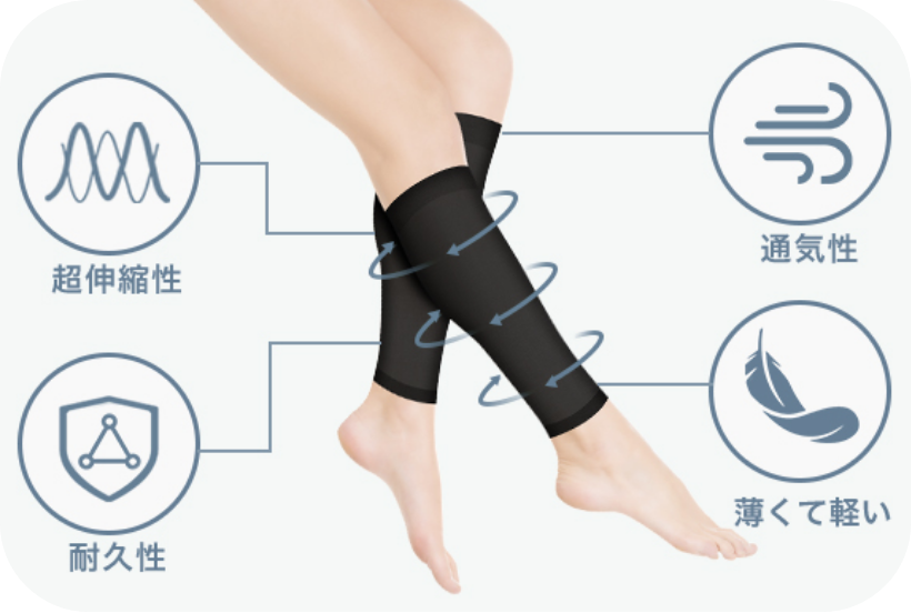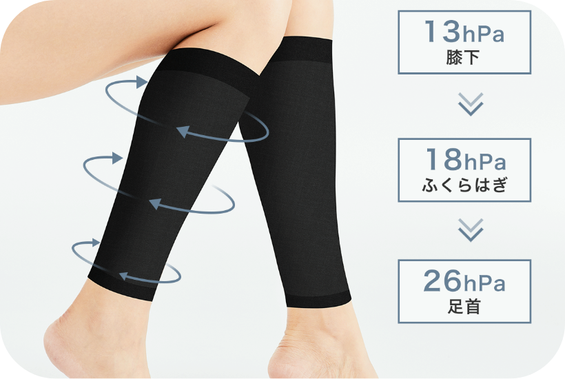 - 膝下13hPa、ふくらはぎ18hPa、足首26hPaの段階圧力設計足首に行くほど圧を強くしめぐりをサポート。