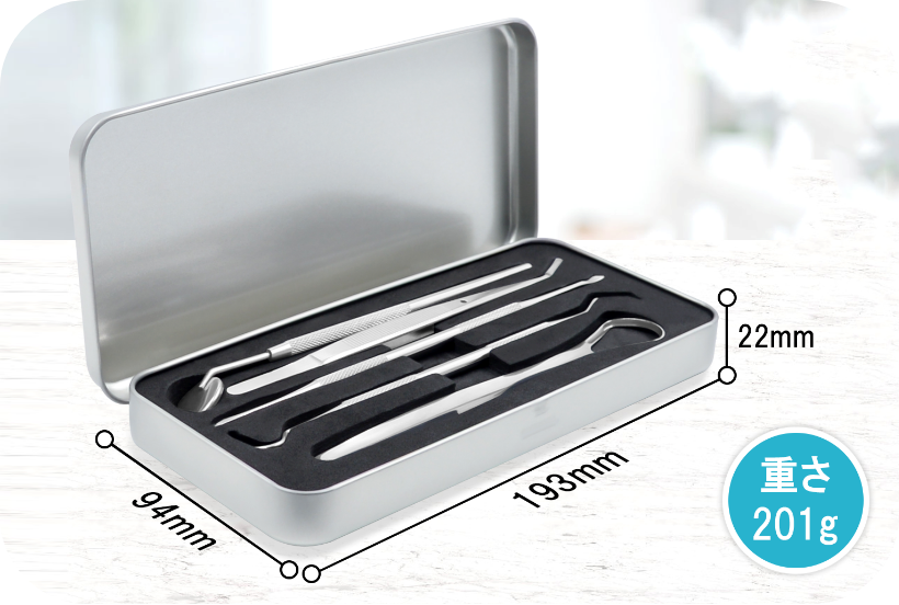 | サイズ(長さ) | 歯科用スケーラ:17.0cm 歯科用探針:16.7cm 歯鏡:15.7cm 歯科治療用ピンセット:15.5cm スクレーバー:17.8cm |