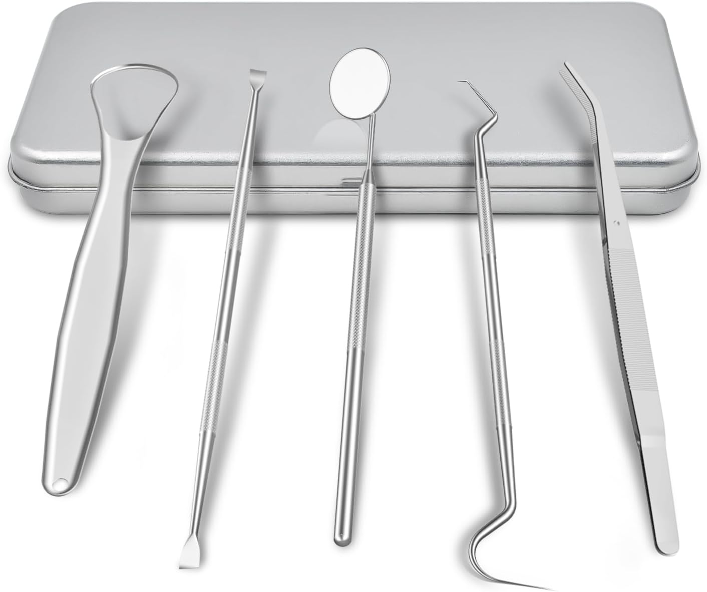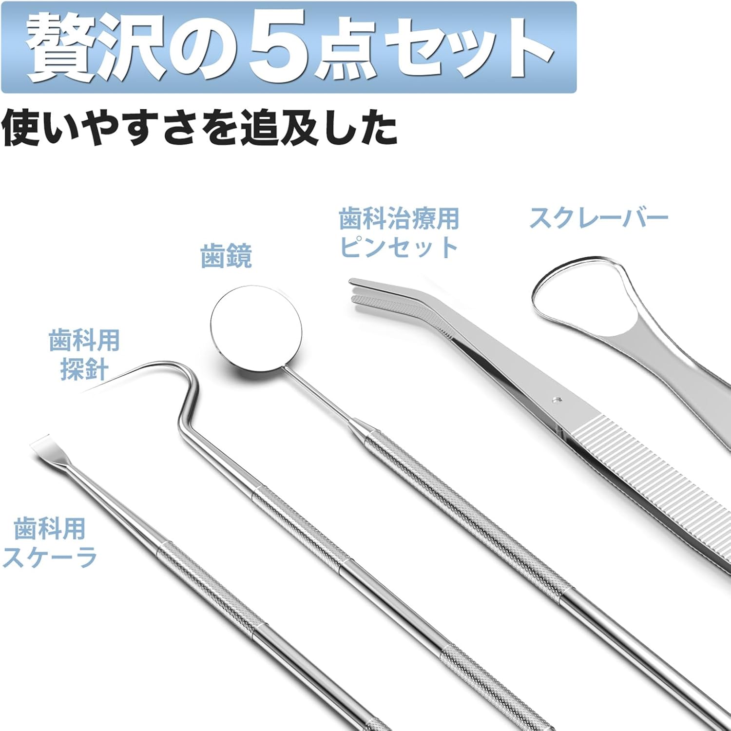 | パッケージ内容 | 1)歯科用スケーラ × 1 2)歯科用探針 × 1 3)歯鏡 × 1 4)歯科治療用ピンセット × 1 5)スクレーバー × 1 以上の5本セット +クッション付き収納ケース × 1 |