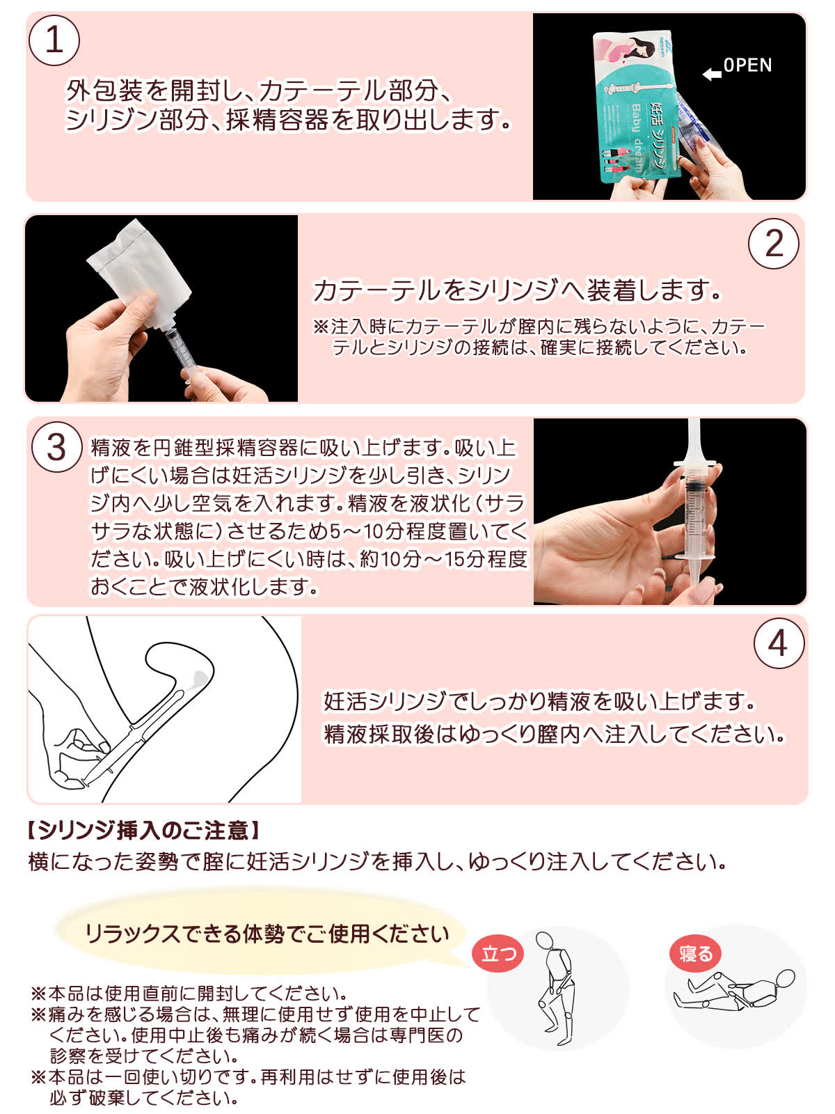 リラックスできる姿勢でカテーテル部分を膣内へ挿入し、シリンジをゆっくり押して、精液を膣内へ注入してください。