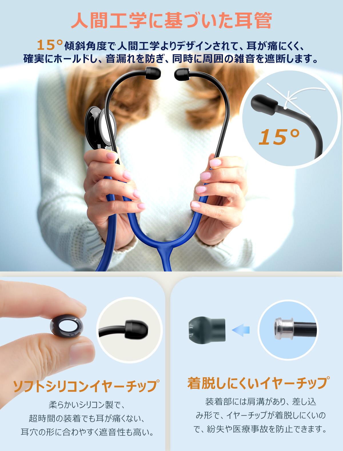 聴診器のイヤーチップが耳にしっかりフィットしていないと、音が漏れたり、聞き取りにくくなります。複数のサイズが付属しているしは自分の耳に最も合うサイズを試してみてください。
