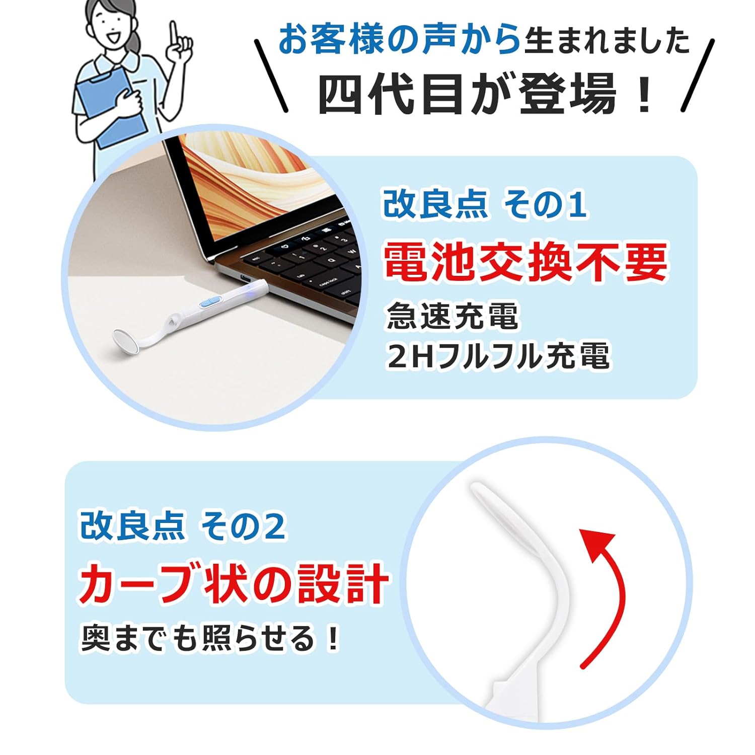 曇り止め強化、カーブ改良でより奥まで見える。USB充電。