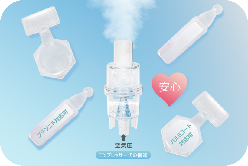 - 薬剤の種類・容量・用法について、必ず医師・薬剤師の指示に従ってください。 危険ですので、水道水・蒸留水・精製水は、医師・薬剤師の指示なしにネブライザで吸入しないでください。