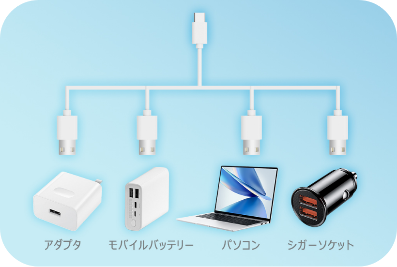 アダプタ、モバイルバッテリーなど電源供給が多数。