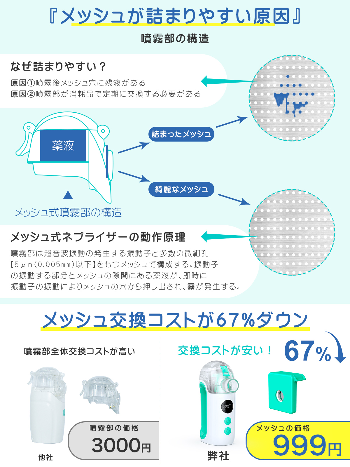 薬液の種類にもよりますので、予め医師に相談してください。 - ・使用後のお手入れが徹底していないとメッシュ部が目詰まりする可能性があります。