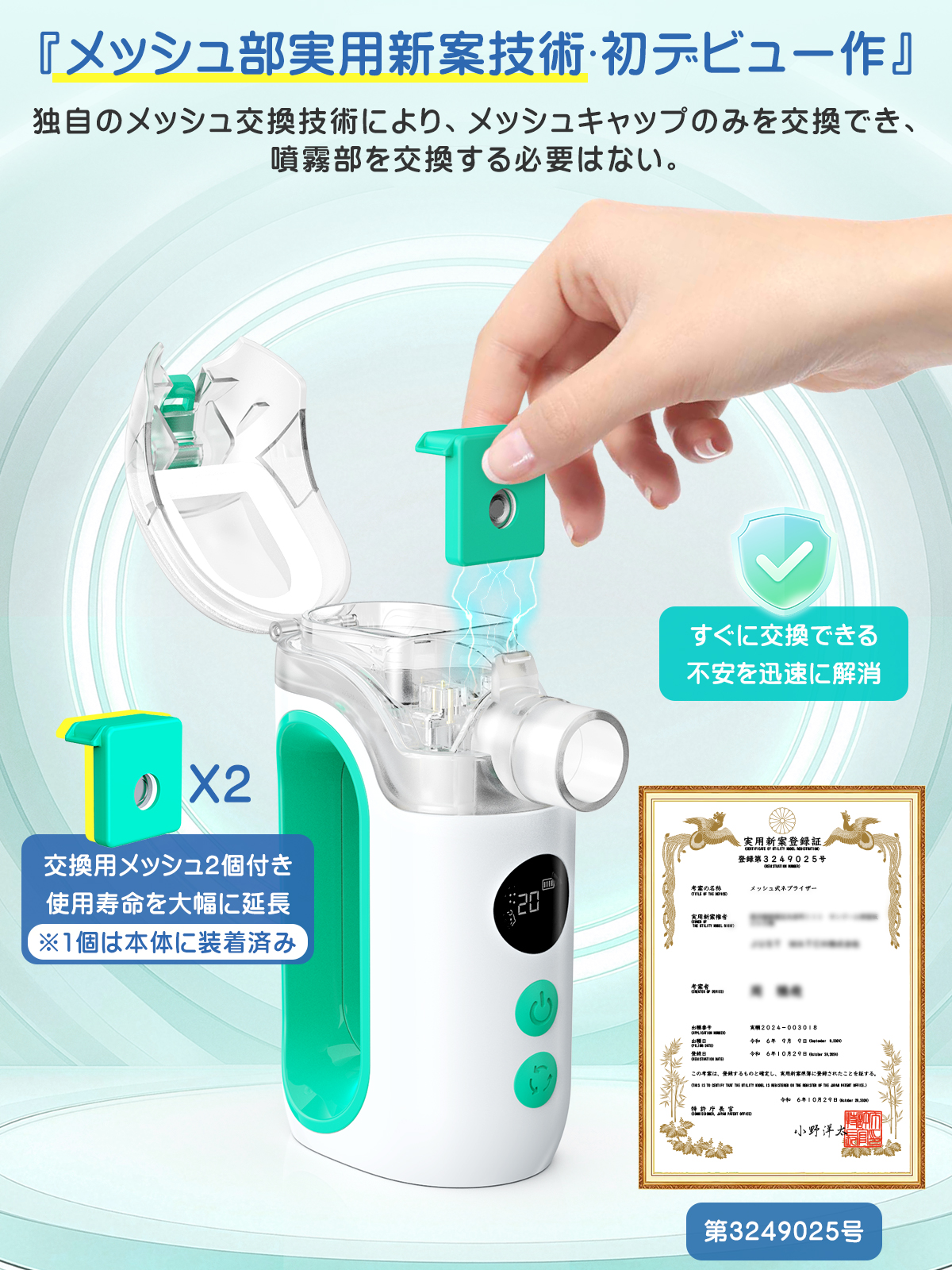 | 保証期間 | 本体:ご購入日から1年間 ※薬液カップ、メッシュキャップ、吸入マスク、マウスピースなどの消耗品は保証対象外です。 |