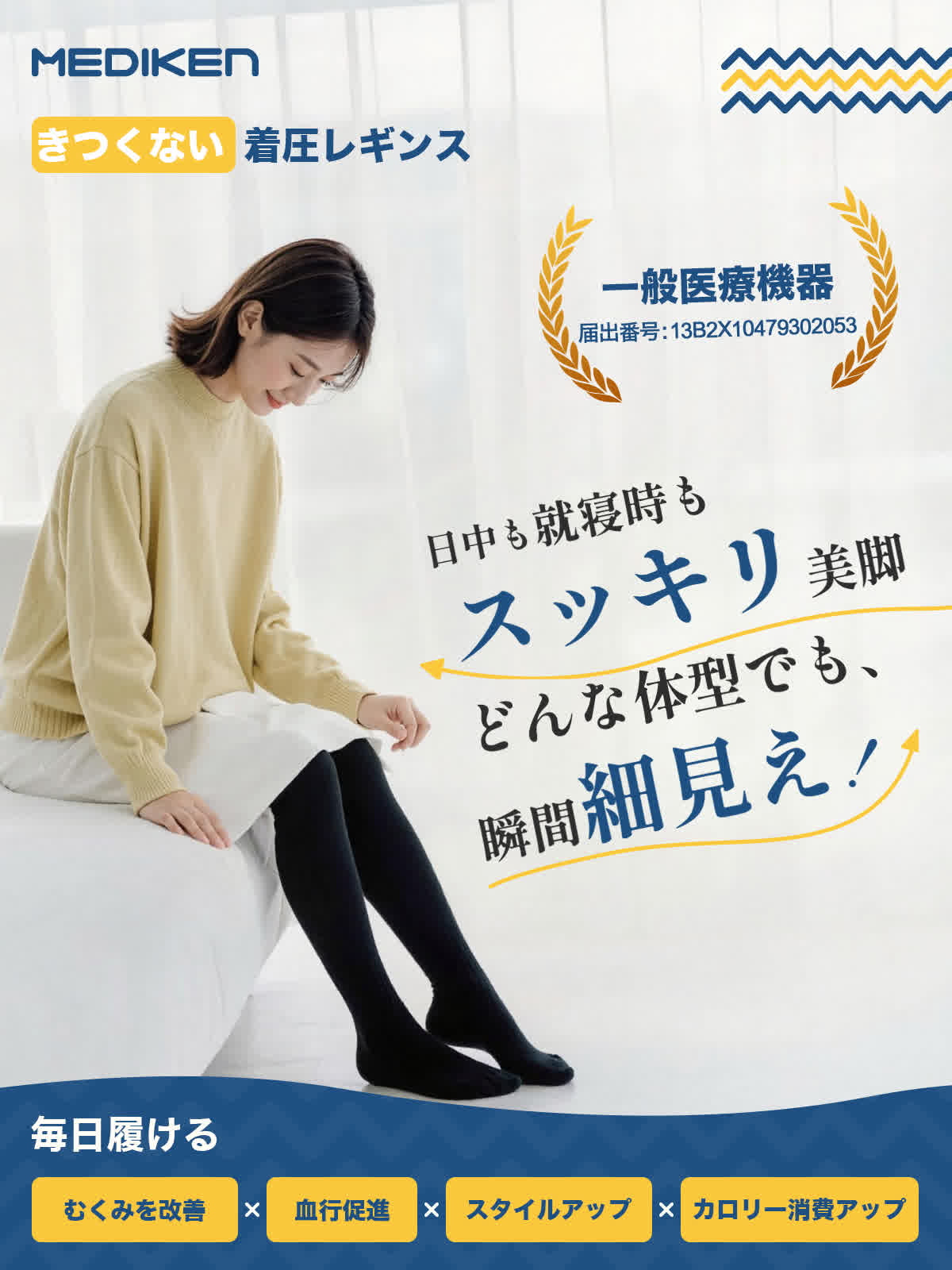 日本一般医療機器の承認を得た確かな品質。日中から就寝時まで24時間、血液とリンパの流れをサポートし、むくみや疲れをリセットします。 - ・医学に基づく「段階圧・黄金比」設計
