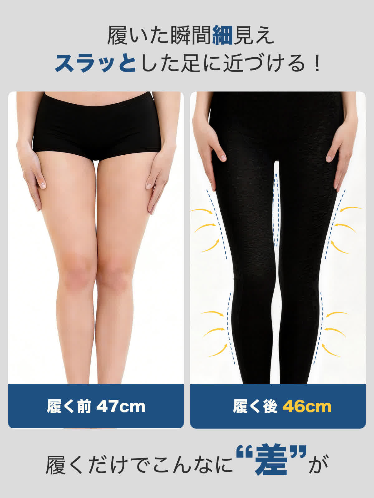 適材適所の圧力で、着用した瞬間から細見えを実感。適度な着圧が日常の動作に負荷を与え、効率的なカロリー消費をサポートします。 - ・高通気・高伸縮素材で一日中ノンストレス
