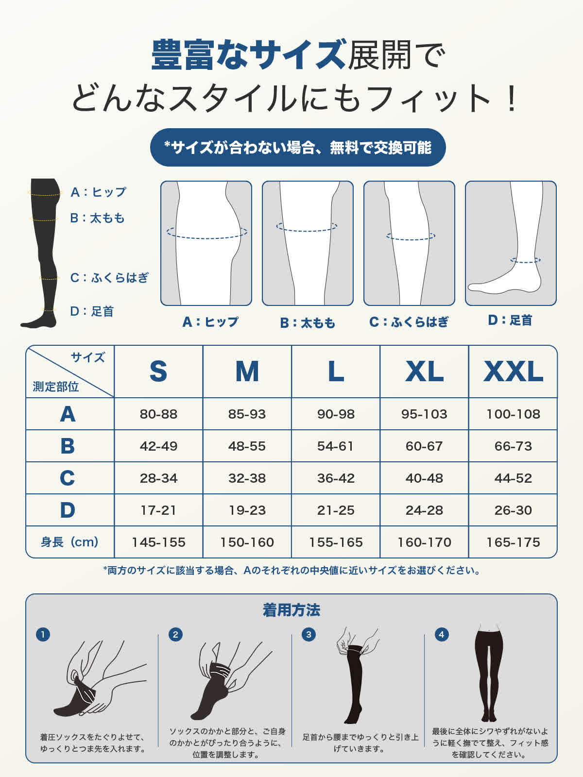 2)本品の使用により、 脚に痛み、しびれ、皮膚や爪の変色、皮膚温の低下、かゆみ、発疹、かぶれ等の異常及びその他装着前に感じなかった不快感、違和感が生じた場合は、直ちに使用を中止してください。<動脈及び静脈の血行障害又は神経障害等を発症するおそれがある為>